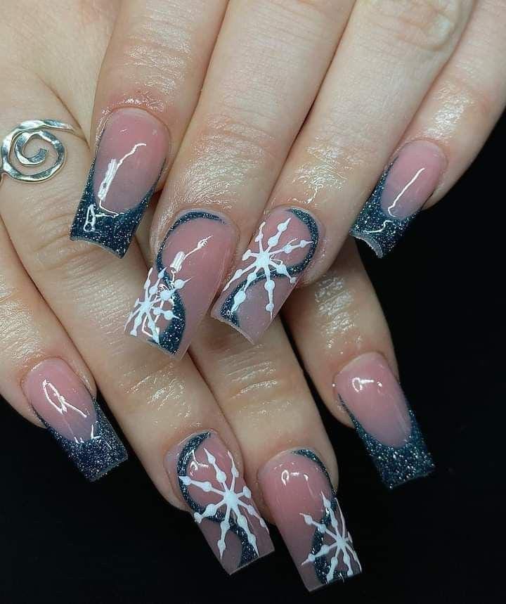 This design features deep, glittery blue tips paired with crisp white snowflakes, creating a bold winter contrast against a natural nude base. It has a chic, dramatic January vibe that feels both icy and elegant.