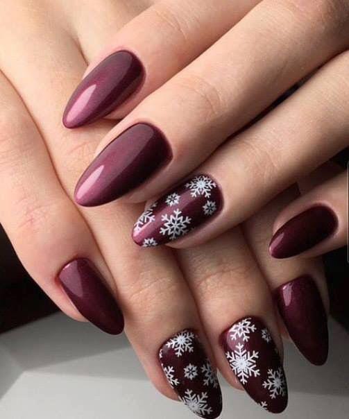 Deep plum nails bring a rich, cozy feel, while the white snowflake accents add a crisp winter touch without overwhelming the design. The glossy finish keeps it elegant and seasonally January perfect.