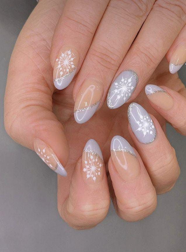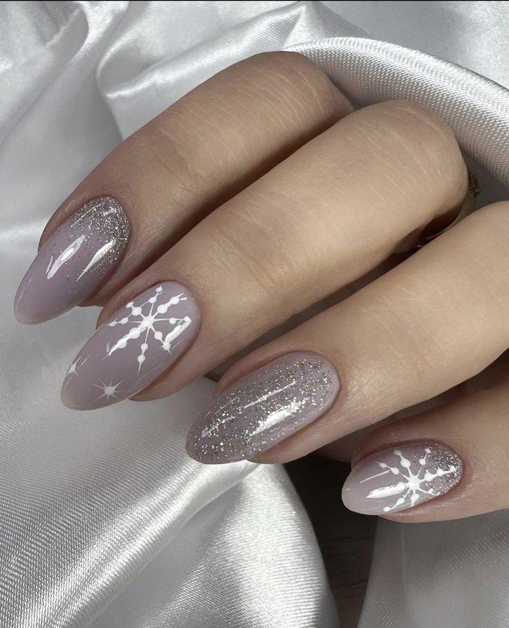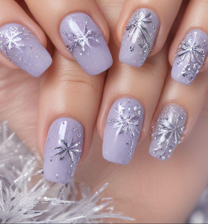 A soft lilac set with a glossy finish, highlighted by silver snowflakes and scattered glitter that gives the nails a frosty, winter-morning shimmer. The whole look feels festive yet calming, perfect for the cool days of January.