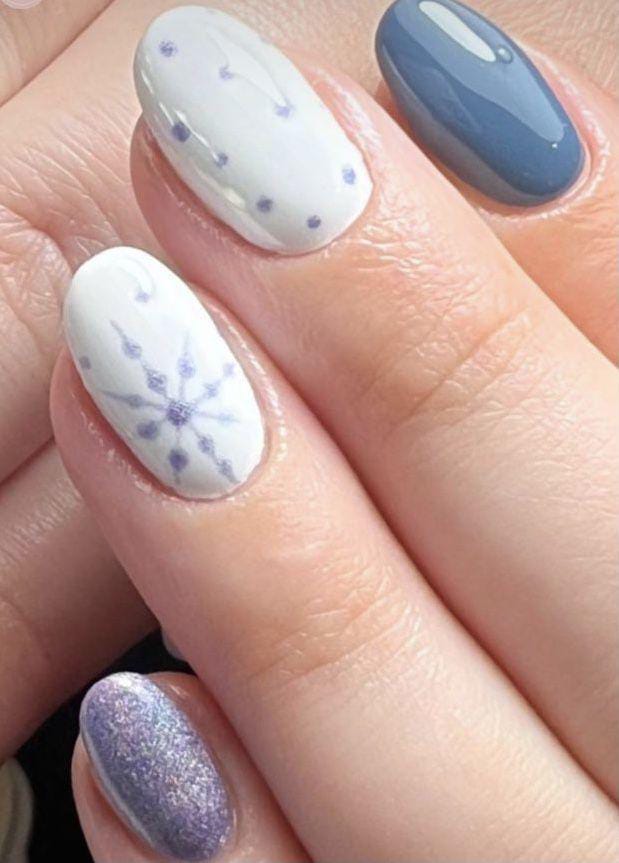 A blend of cool white, midnight blue, and shimmery lavender creates a gentle winter palette, with soft snowflake details adding a frosty touch. The mix feels refreshing and perfectly January suited for early-year styles.