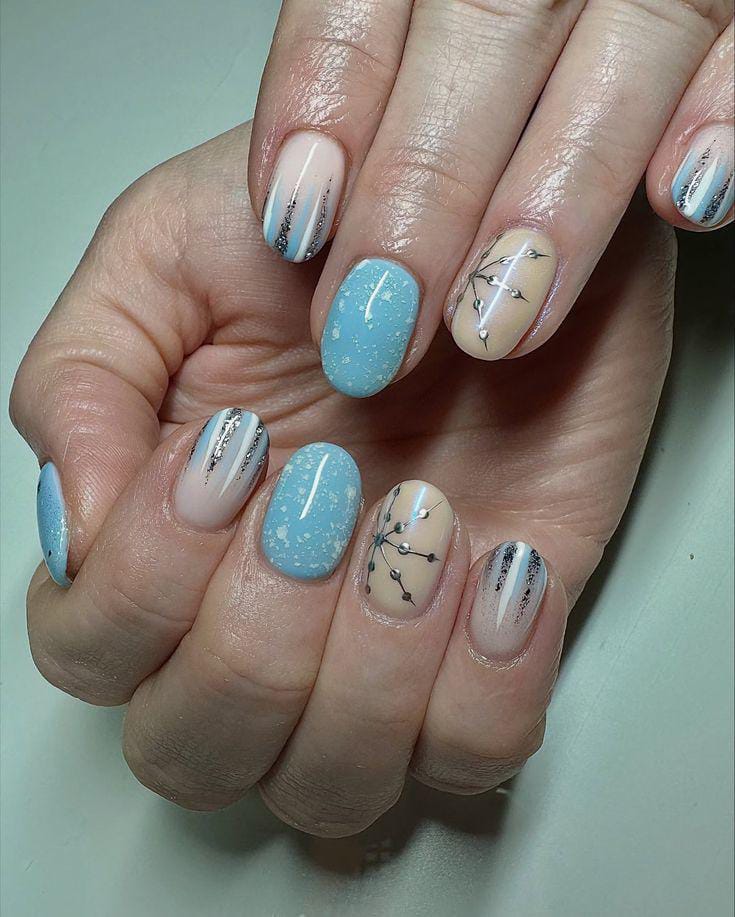 This design blends soft nude and icy blue tones with delicate silver accents, creating a calm winter look that feels fresh and frosty. Subtle line work and tiny branch-like details add a minimalist seasonal January touch.