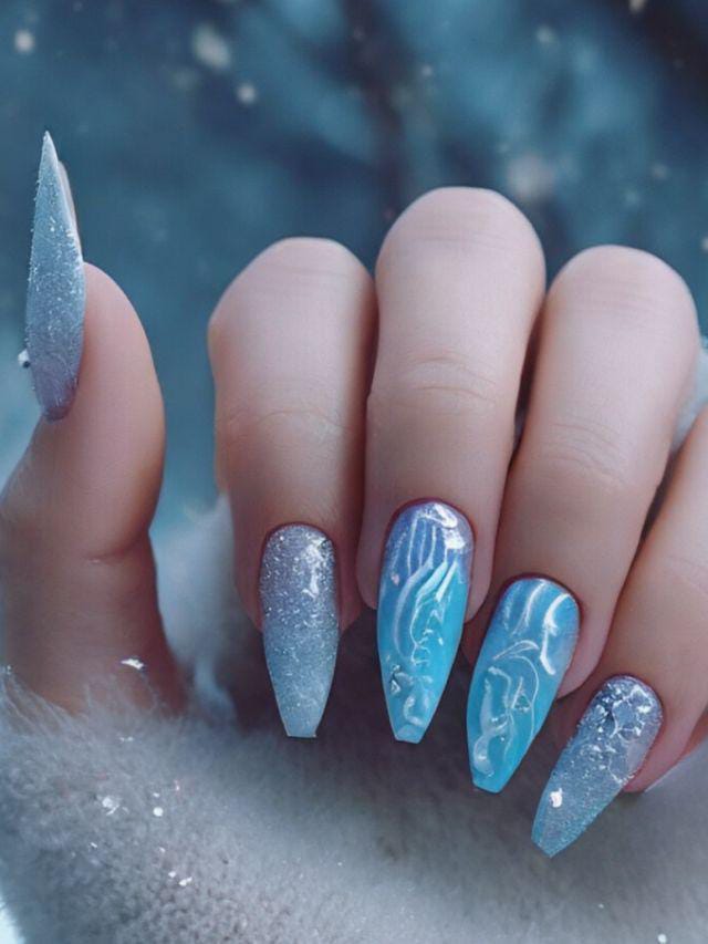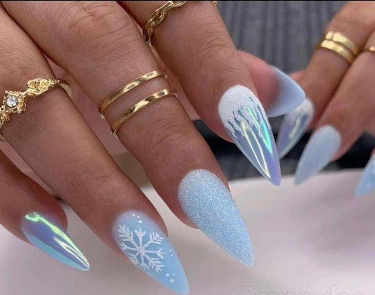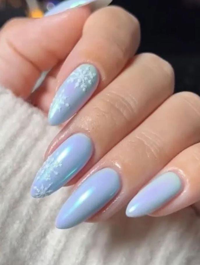 Long pointed nails in shimmering icy blue create a bold, dramatic winter January aesthetic. Snowflakes, frosted tips, and chromed highlights bring a glamorous “frozen fantasy” feel.