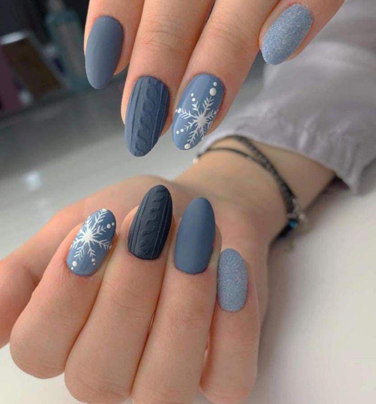 Matte slate-blue nails paired with sweater-texture accents give this set a warm, cozy January vibe. Snowflakes and soft frosted finishes add a wintry charm without being too flashy.