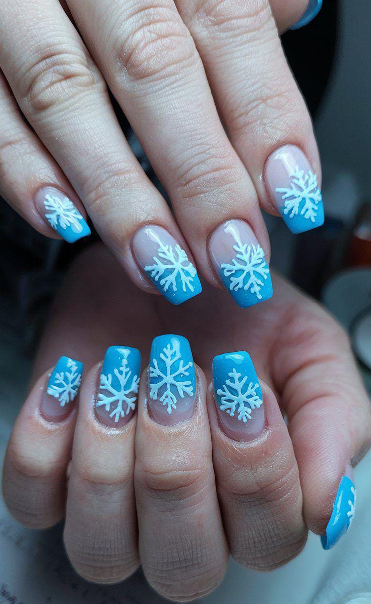 Bright sky-blue ombre tips paired with detailed white snowflakes create a playful, frosty look reminiscent of fresh winter mornings. The mix of color and clear base keeps it crisp and modern January vibe.