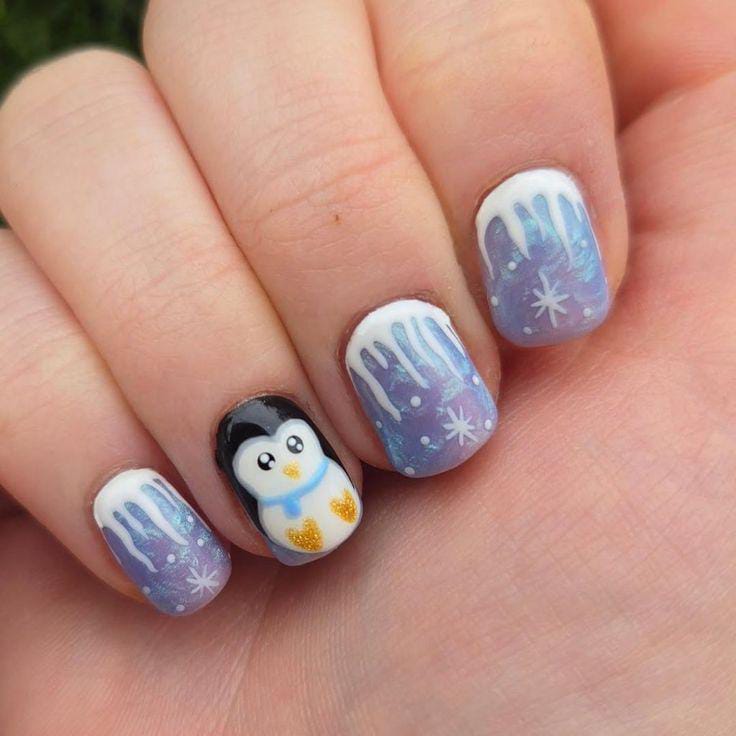 A playful mix of purple-blue gradients, snowy drips, and soft white stars sets a fun winter scene. The adorable penguin accent nail makes the design feel cheerful and perfect for brightening cold January days.