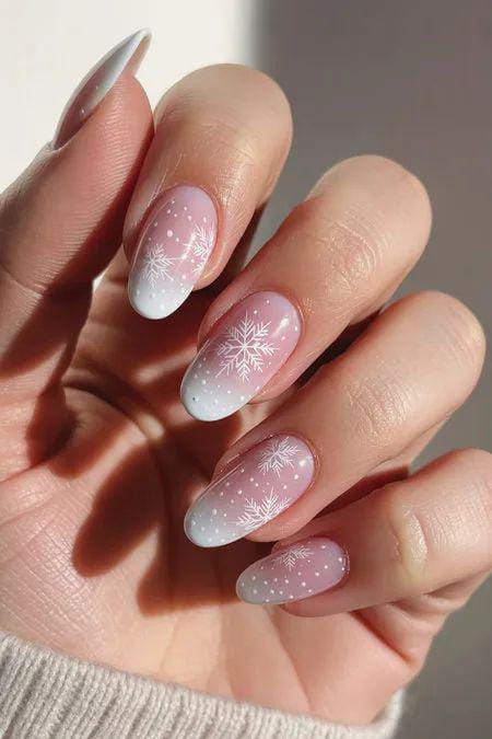 This design blends a soft pink-to-white gradient with delicate snowflakes and tiny dotted accents, giving the nails a dreamy, frosted look. It feels light, airy, and perfect for capturing January’s gentle winter chill.