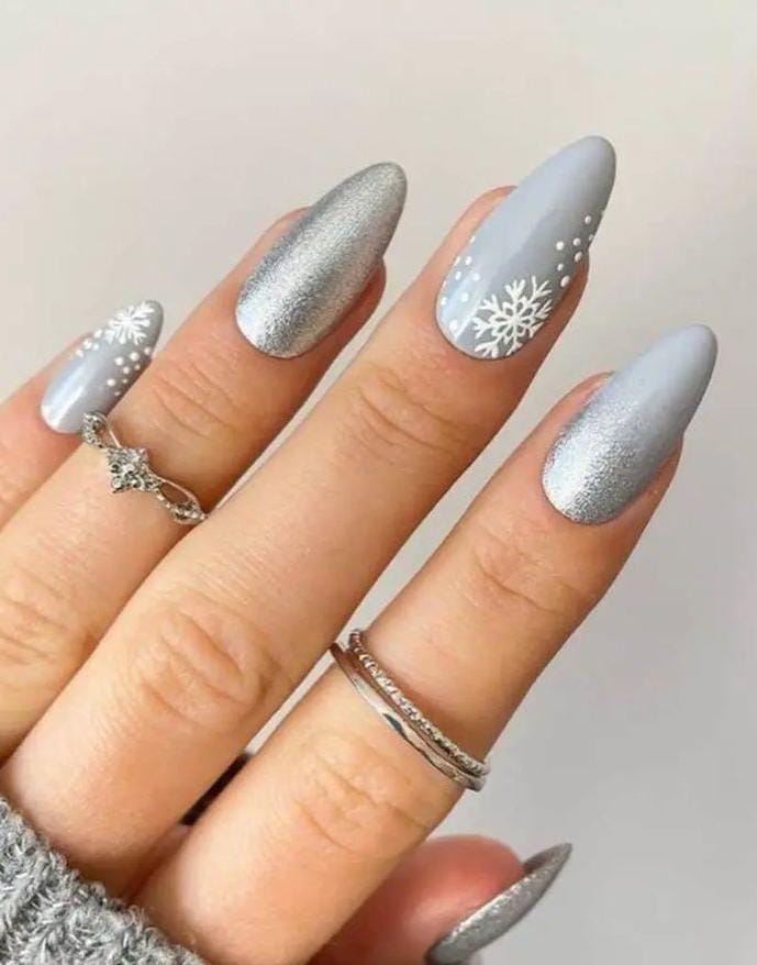With its cool grey tones and metallic silver shimmer, this design brings a sleek, modern take on winter nails. The scattered white snowflakes and dots add a crisp, frosty edge that feels perfectly January seasonal.
