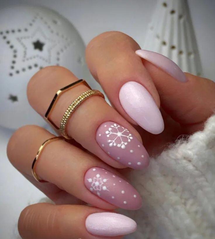 Soft pink nails with matte and pearly finishes are decorated with minimal white snowflakes and dotted accents, creating a cozy, romantic winter feel. The look is gentle, feminine, and perfect for a subtle January aesthetic.