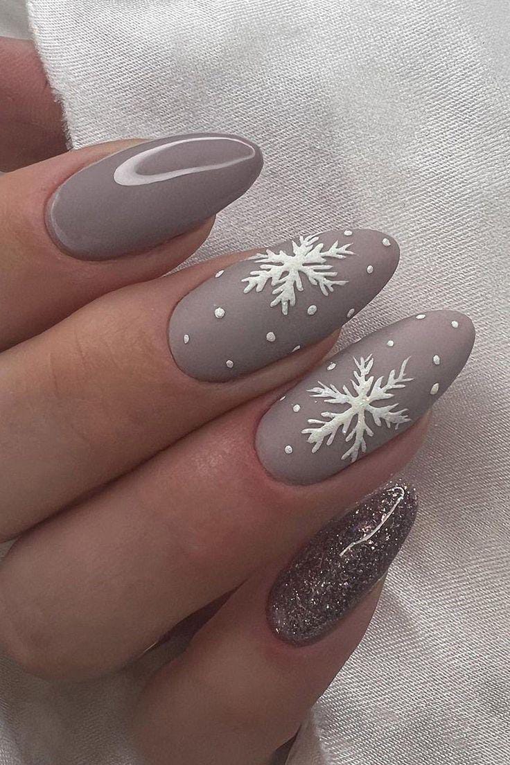 Soft taupe nails are paired with bold white snowflakes and touches of shimmering glitter, creating a chic, wintry nighttime January vibe. The mix of shine and minimal art makes the look elegant yet subtly festive.