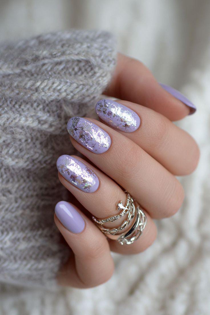 Light lavender nails are paired with silver foil accents, giving the design an icy, frosted effect perfect for cold January days. It feels soft, feminine, and wintery without being overly festive.