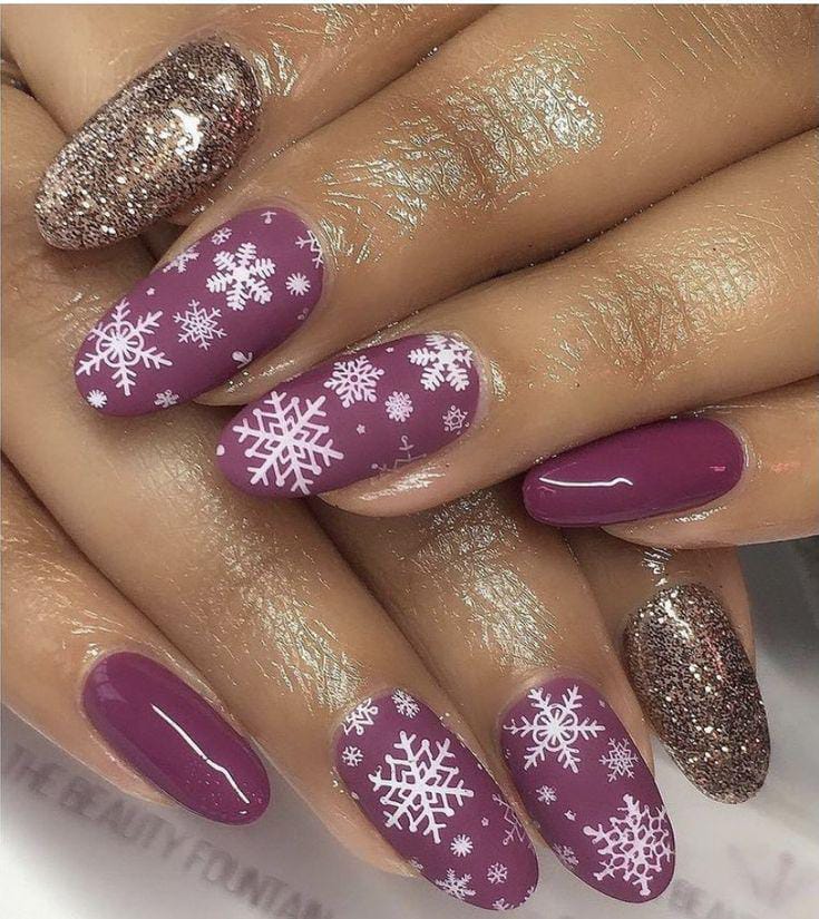 These matte mauve nails feature crisp white snowflake patterns that stand out beautifully against the velvety base. The look is minimal, cozy, and gives off a soft winter-January aesthetic.