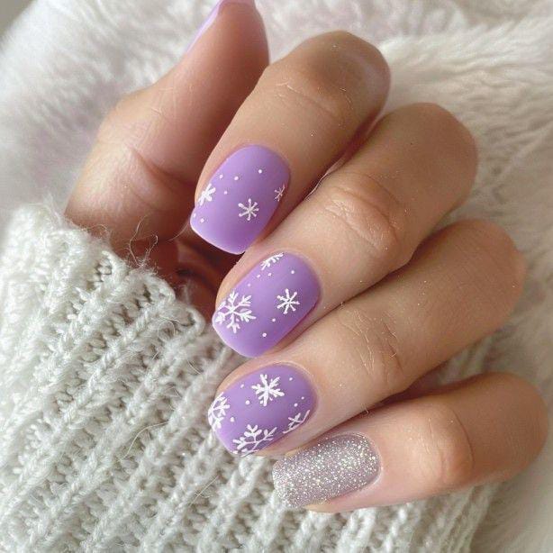 Matte lilac nails decorated with tiny white snowflakes give a sweet, cozy winter look, while the single silver-glitter accent nail adds just the right amount of shimmer. The overall vibe is cute, light, and perfect for January’s chilly mood.