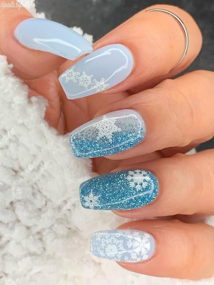This design blends soft icy-blue nails with white accent nails decorated with delicate blue snowflakes, creating a crisp and wintery January look. A touch of silver glitter adds a subtle sparkle that feels perfect for the cold season.