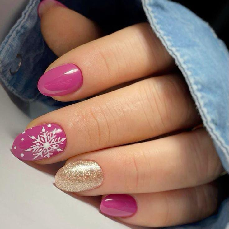 A bold pink base mixed with a gold-shimmer accent nail and a white snowflake detail creates a fun, vibrant twist on January winter nails. It feels playful yet seasonal, perfect for adding warmth to cold days.