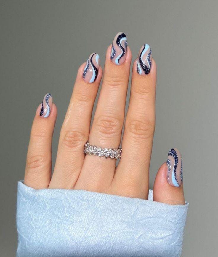These nails feature flowing wave patterns in pale blue, navy, and silver glitter, creating a cool, modern winter January aesthetic. The wavy lines give it a breezy, frozen-sky vibe.