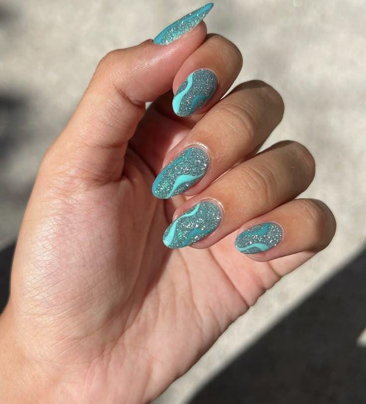 A mix of teal tones and silver glitter swirls gives this design a fresh, frosty feel with a slightly bolder color story. The look is wintry but unique, leaning toward a cool January ocean-inspired vibe.