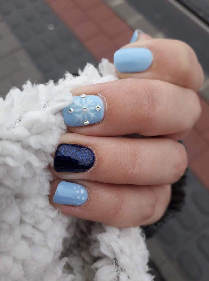 A playful mix of baby blue, deep glittery navy, and a snowflake accent nail creates a cozy yet stylish winter January vibe. The little pearl-like dots and rhinestones give it a soft, frosty charm.