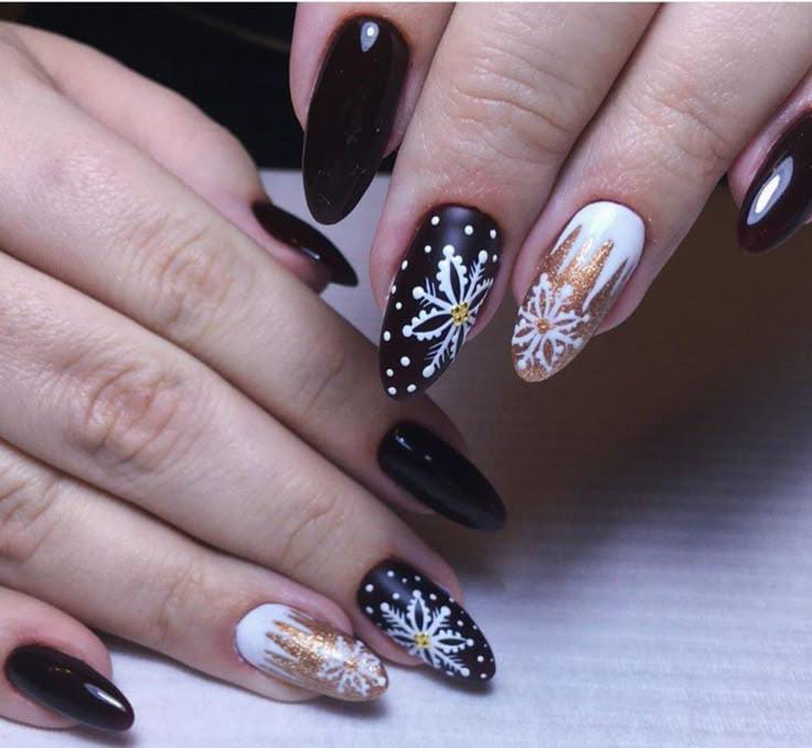 Bold dark nails contrast beautifully with white and gold snowflake accents, adding a dramatic, wintry elegance. The mix of black, white, and gold creates a sophisticated January statement.