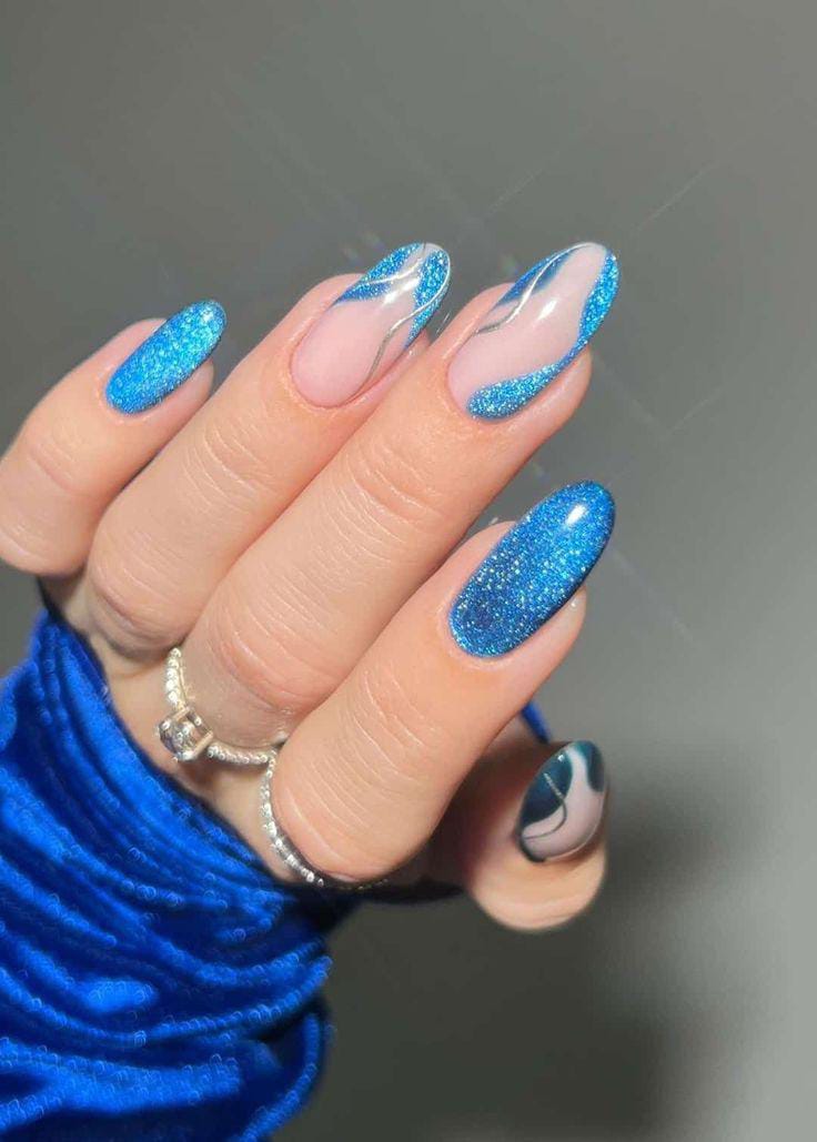 This design blends bright icy-blue glitter with soft nude bases, accented by fluid, wave-like swirls that give it a cool, winter-fresh vibe. It feels modern, glossy, and perfect for a crisp January look.