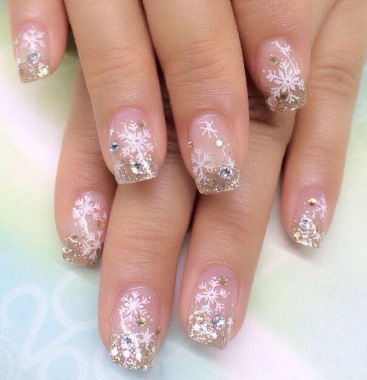 Soft nude nails are dressed with white snowflakes and sparkling gold glitter tips, giving a warm yet wintery glow. The subtle crystals add a festive, frosted January finish.