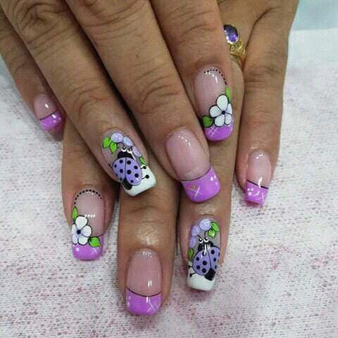 With lavender French tips decorated with painted flowers and dotted ladybugs, this design has a feminine, garden-inspired look.