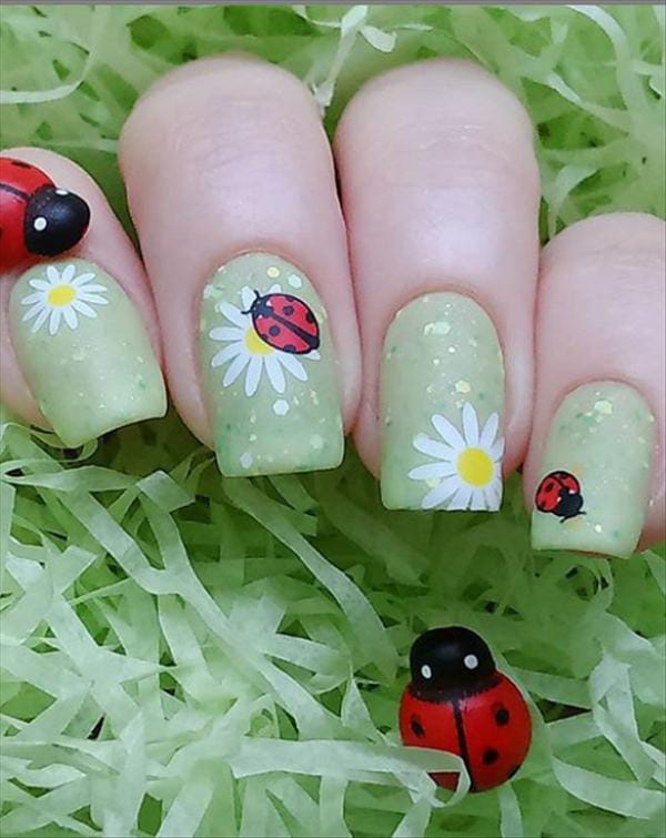 These nails feature a soft green base sprinkled with daisies and bright little ladybugs, giving off the feeling of a fresh spring meadow in full bloom.
