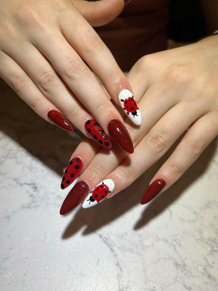 Deep red nails paired with crisp white accents showcase bold ladybug art that instantly stands out. The glossy finish and playful dots make the look vibrant, fun, and perfect.