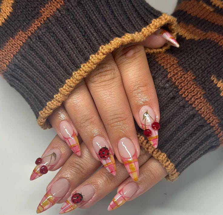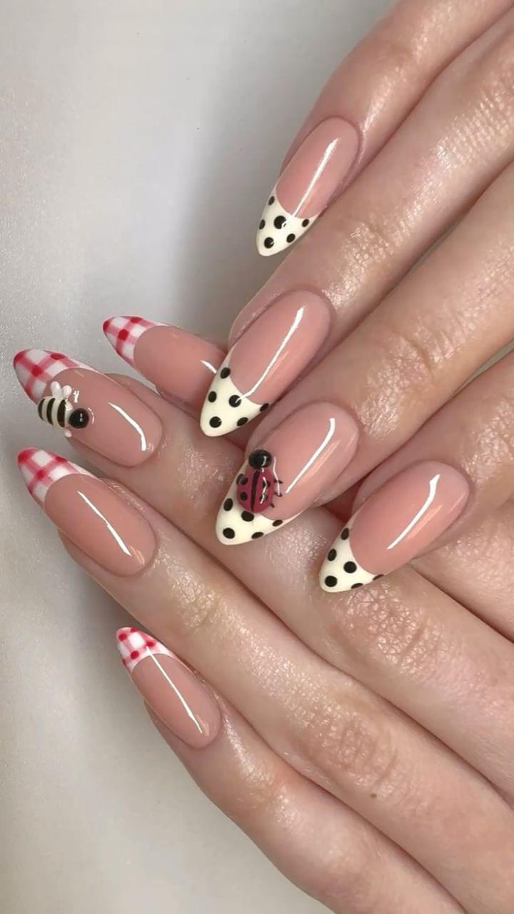 With nude bases, checkered tips, and polka dots, this design feels inspired by a summer picnic blanket. A tiny ladybug detail adds a whimsical twist, balancing chic style.