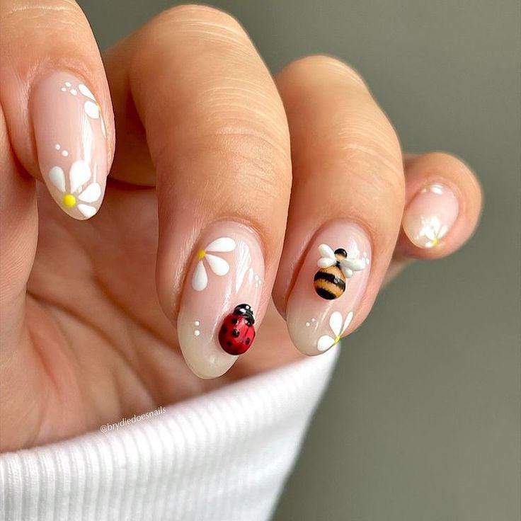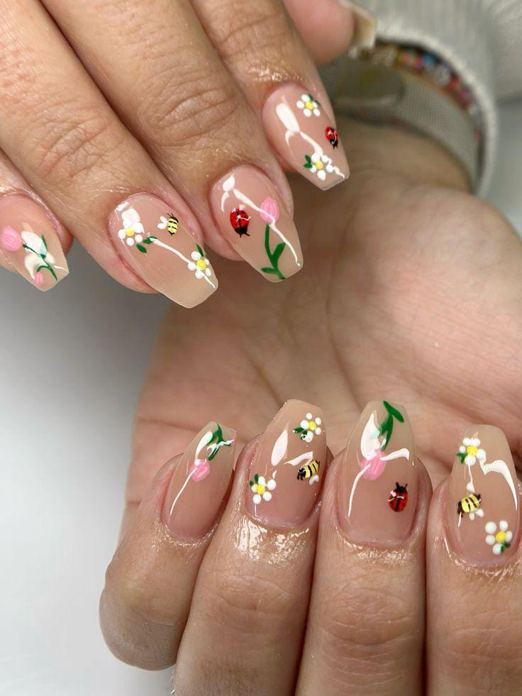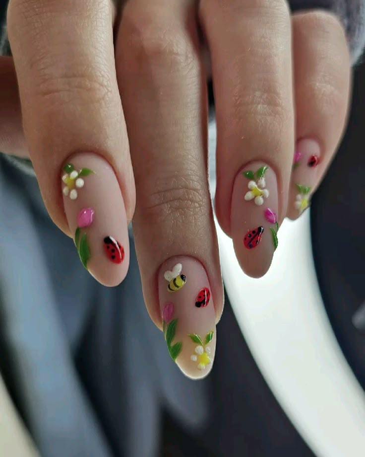 A soft nude base decorated with tiny daisies, pink buds, buzzing bees, and bright ladybugs, giving a fresh springtime garden vibe.