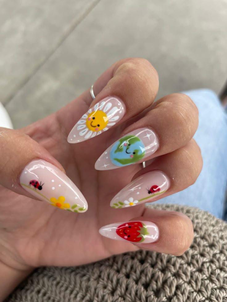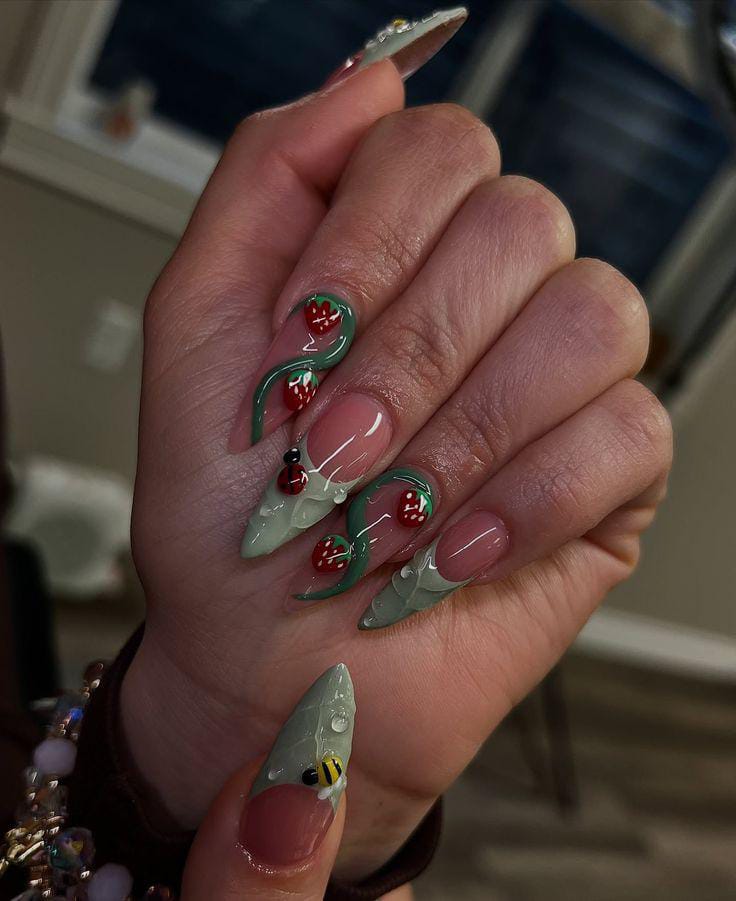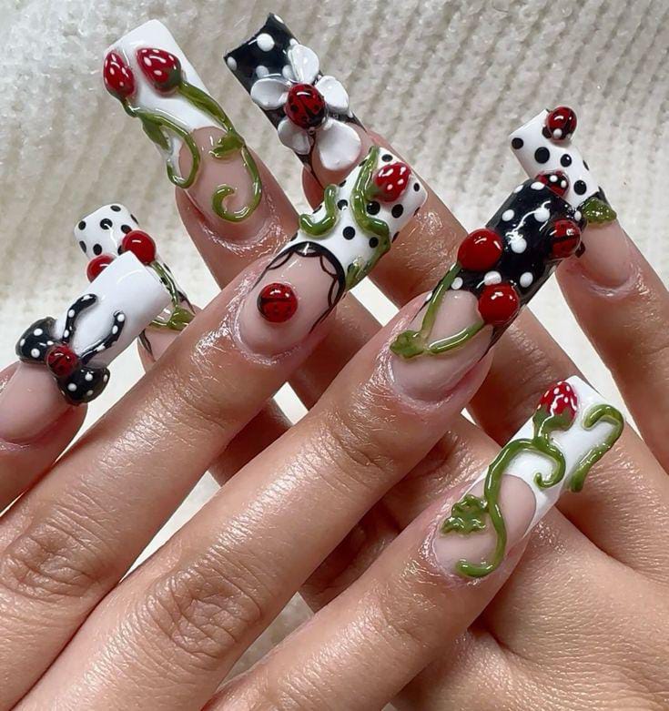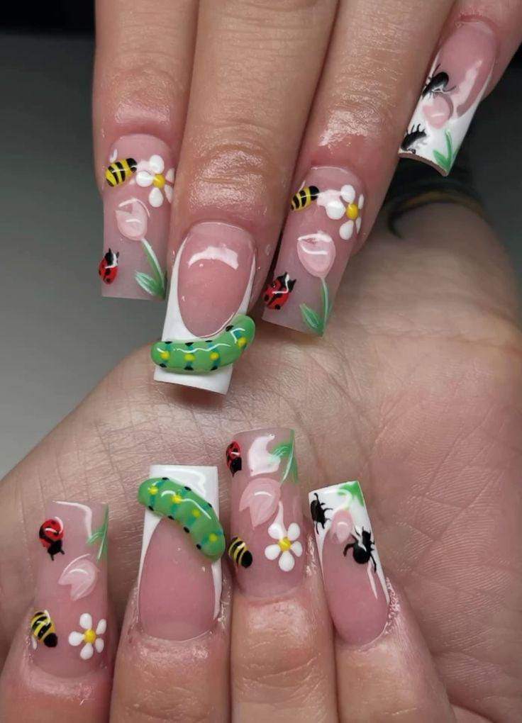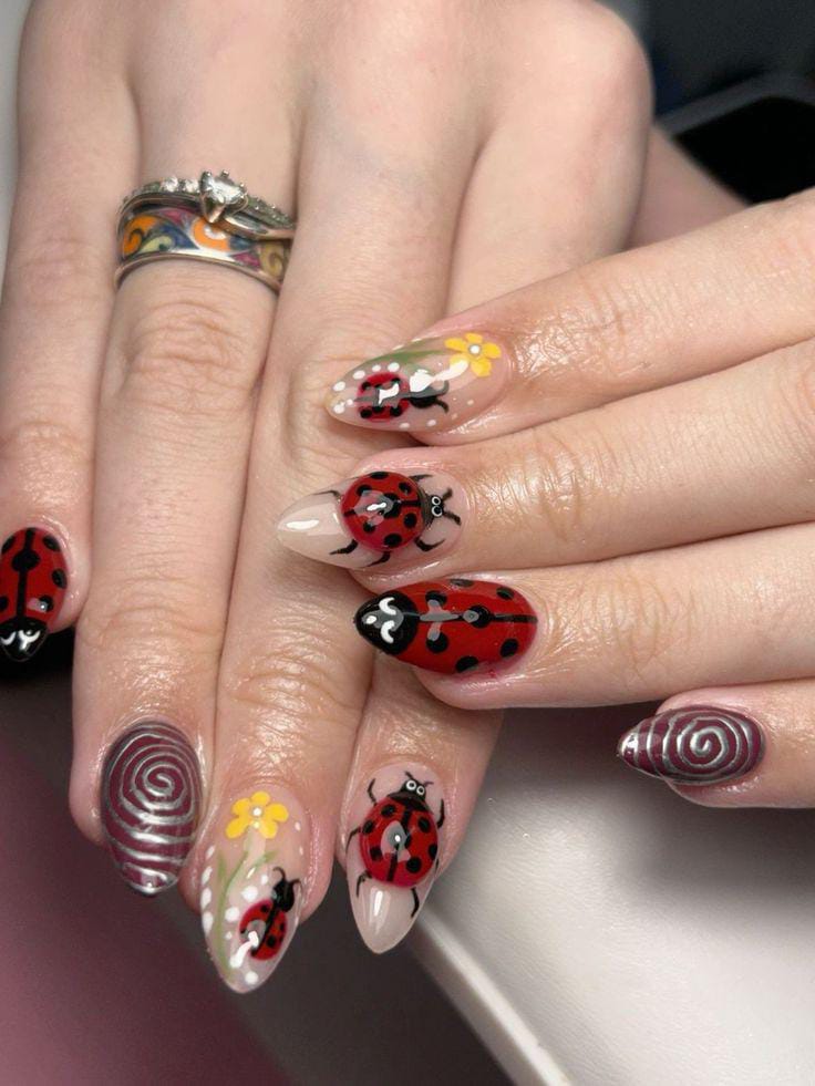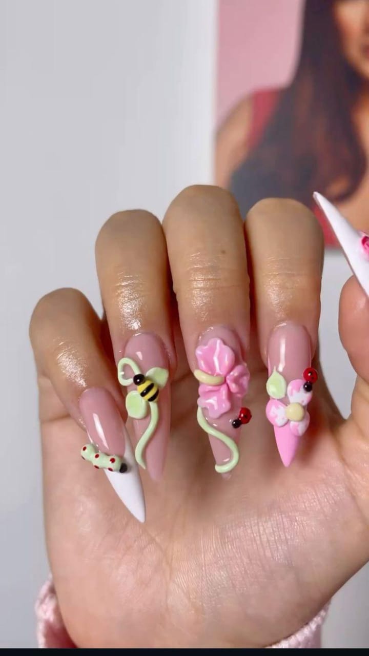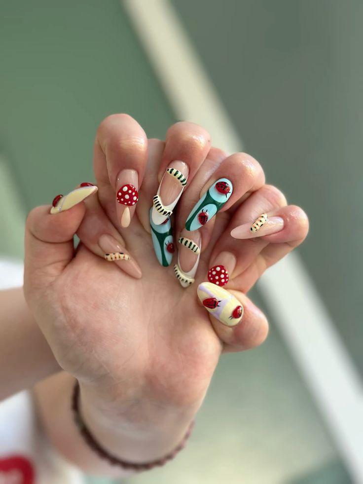 With bold floral accents, bees, ladybugs, and even caterpillars, these nails feel like a miniature meadow full of life.