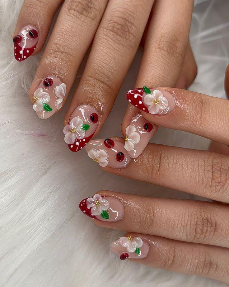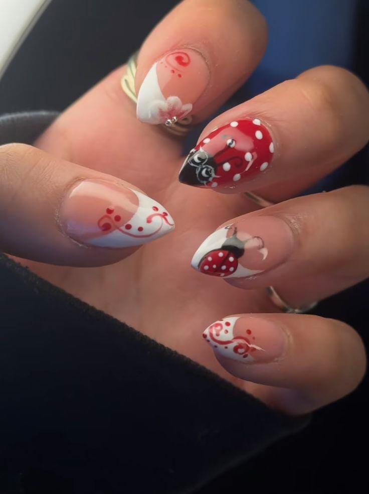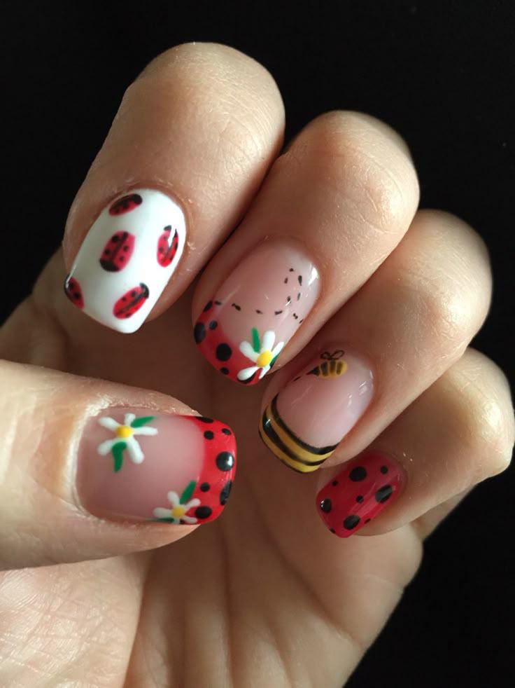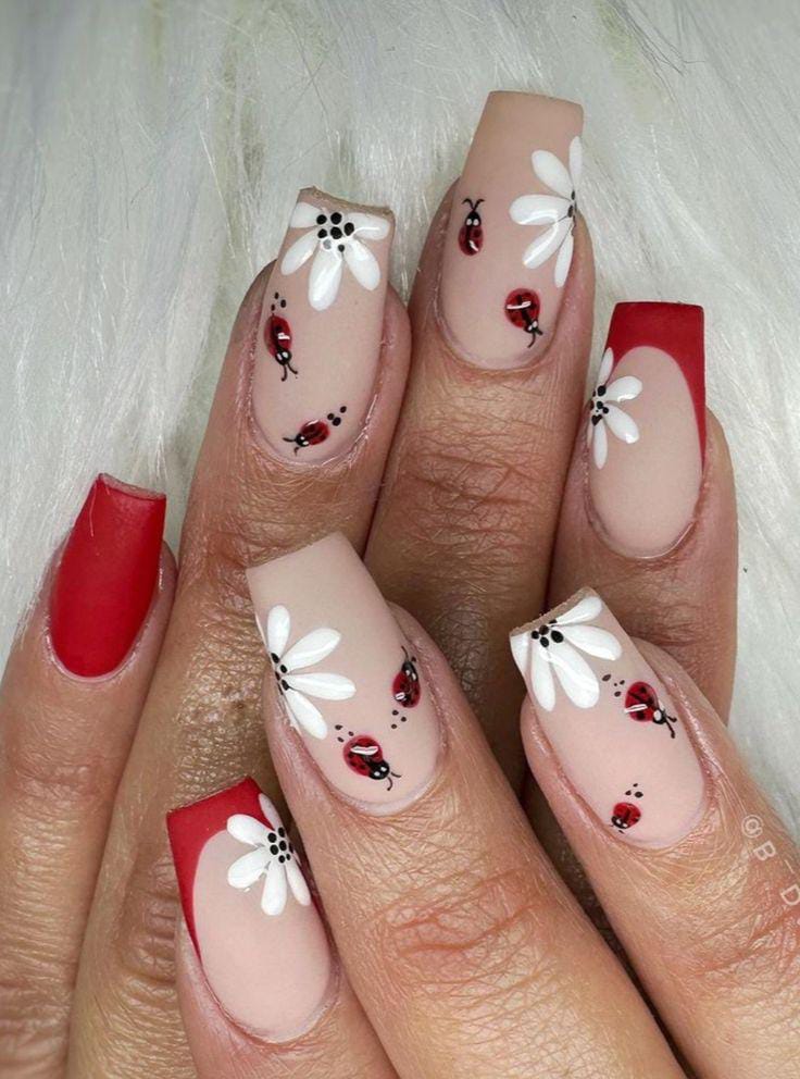 Soft nude nails are brightened with red tips, white daisies, and tiny ladybugs scattered across the design. The combination of flowers and little bugs feels fresh, cheerful.