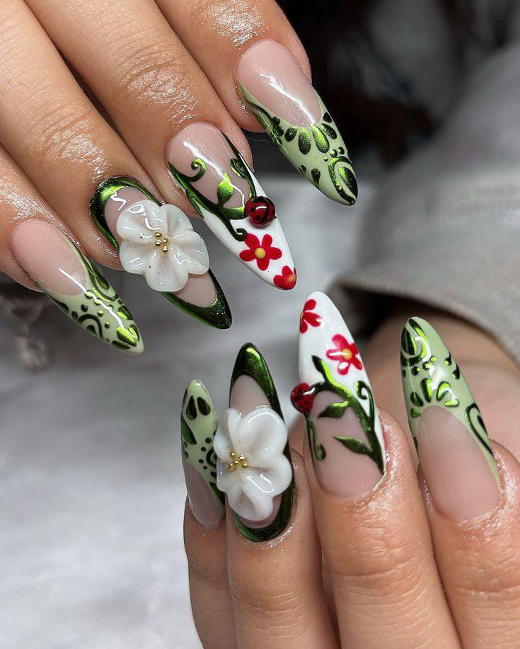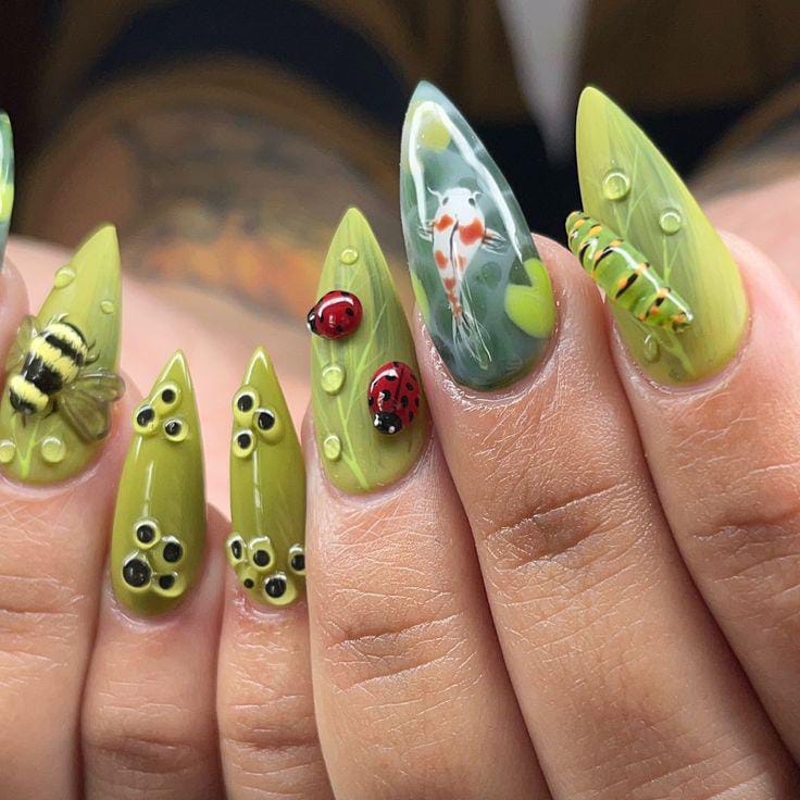 Bold leafy patterns paired with 3D ladybugs and bees make this design feel like a little forest scene on your nails. It’s vibrant, nature-inspired, and full of lively garden energy.