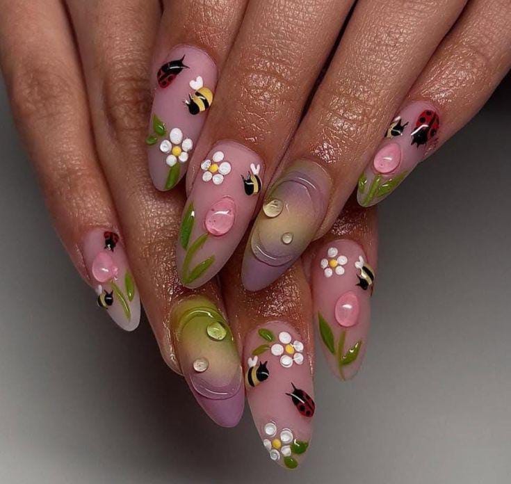Soft pastel gradients set the stage for daisies, green leaves, bees, and ladybugs, giving the nails a dreamy meadow-inspired look.