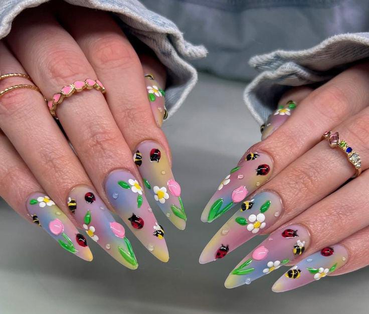 Long stiletto nails with a dreamy pastel ombré base, scattered with 3D-like flowers, bees, and ladybugs for a playful meadow-inspired look.