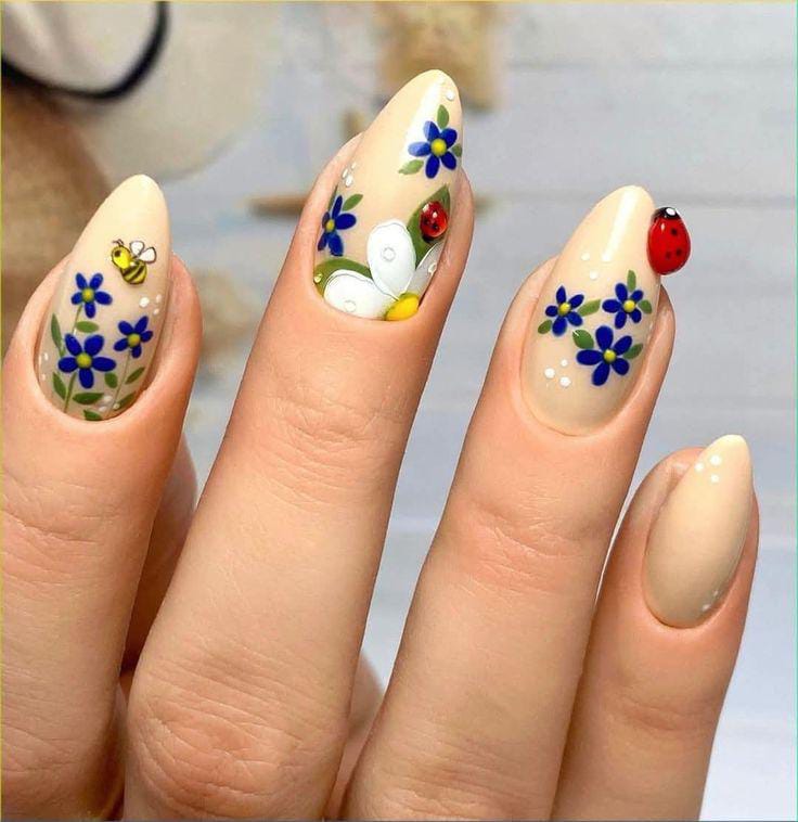 Creamy nude nails accented with bold blue and white blooms, paired with tiny bees and ladybugs, creating a cheerful wildflower effect.