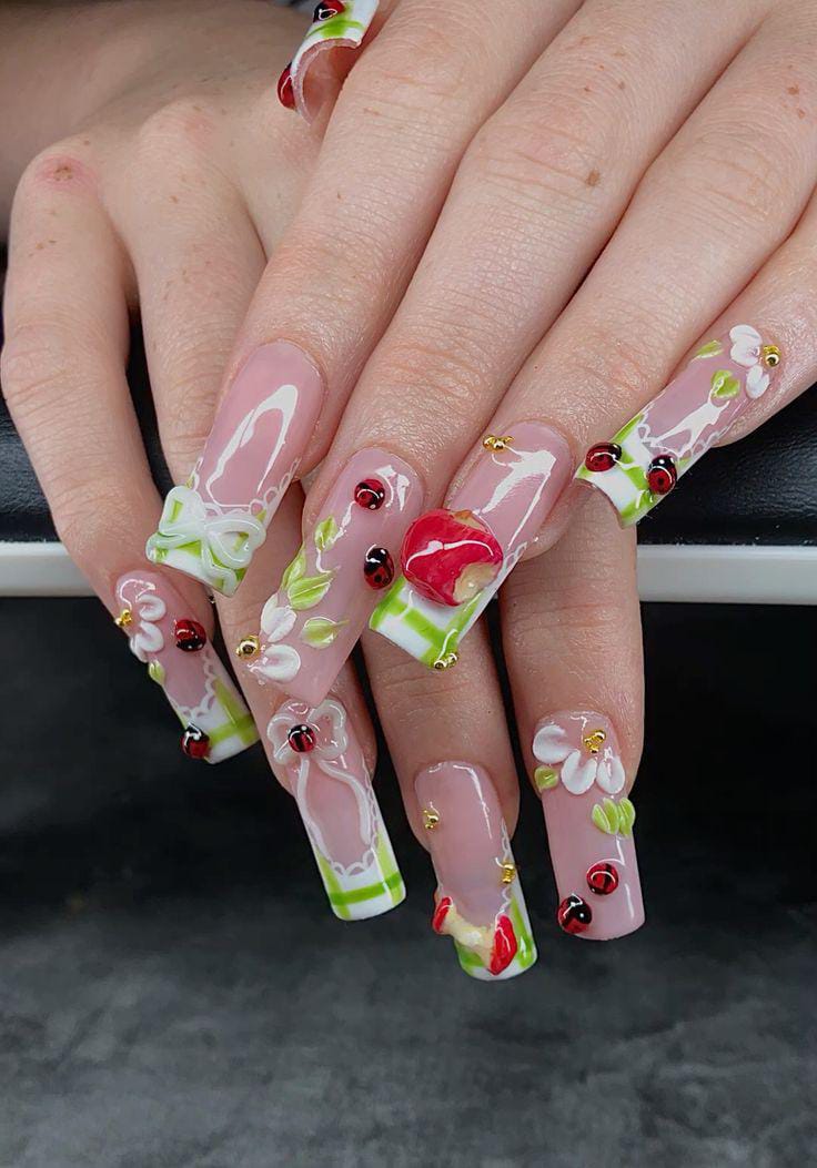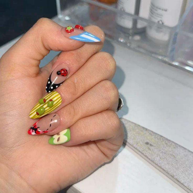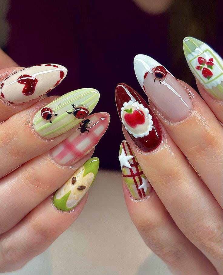 This set feels like a lively picnic on your nails, blending strawberries, apples, plaid patterns, and little crawling ladybugs. With glossy finishes and a mix of bright reds and greens, the design is full of charm, whimsy, and summery vibes.