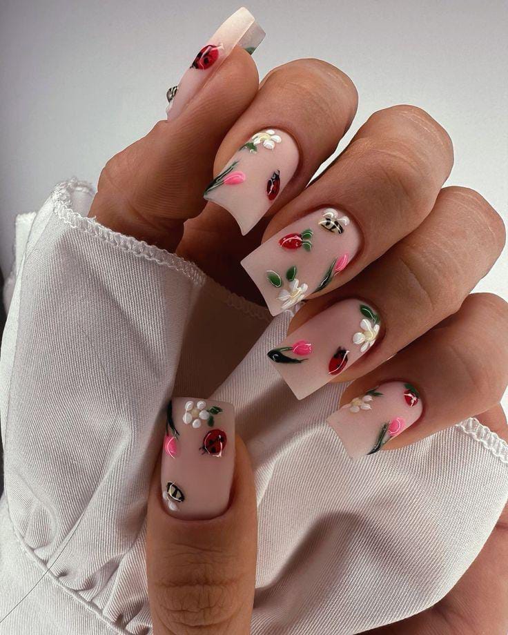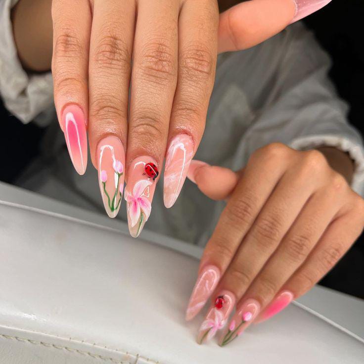 Soft pink tones with delicate floral accents and a tiny ladybug detail give these nails a fresh, feminine, and spring-inspired vibe.
