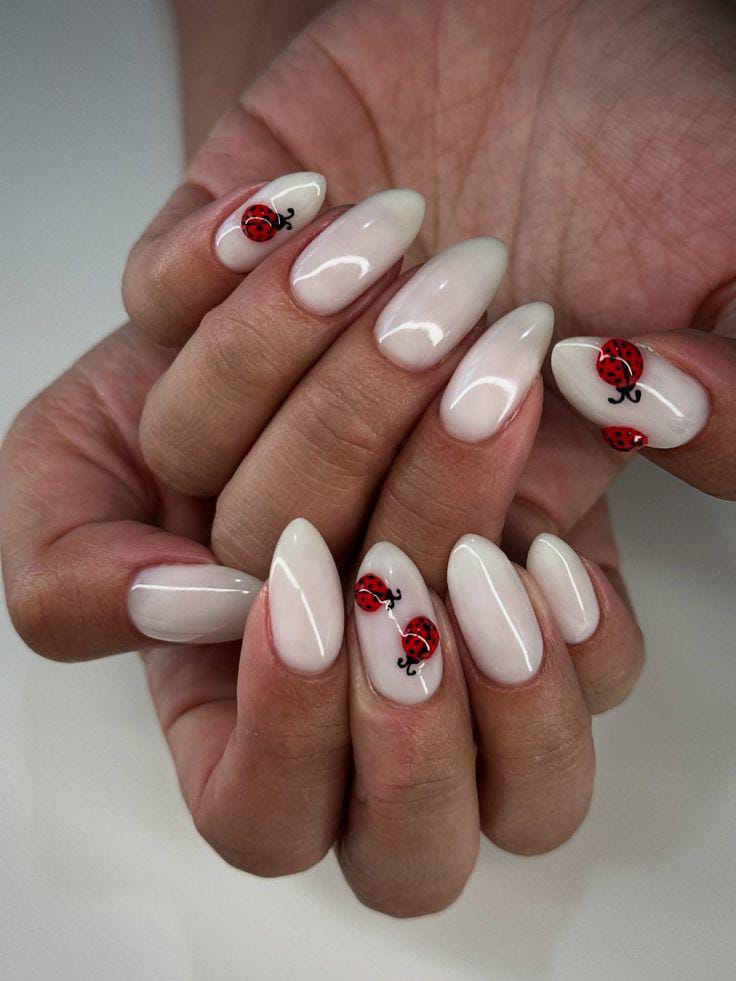 A clean nude-white base with simple ladybug details keeps the design classy while still adding a pop of playful charm.