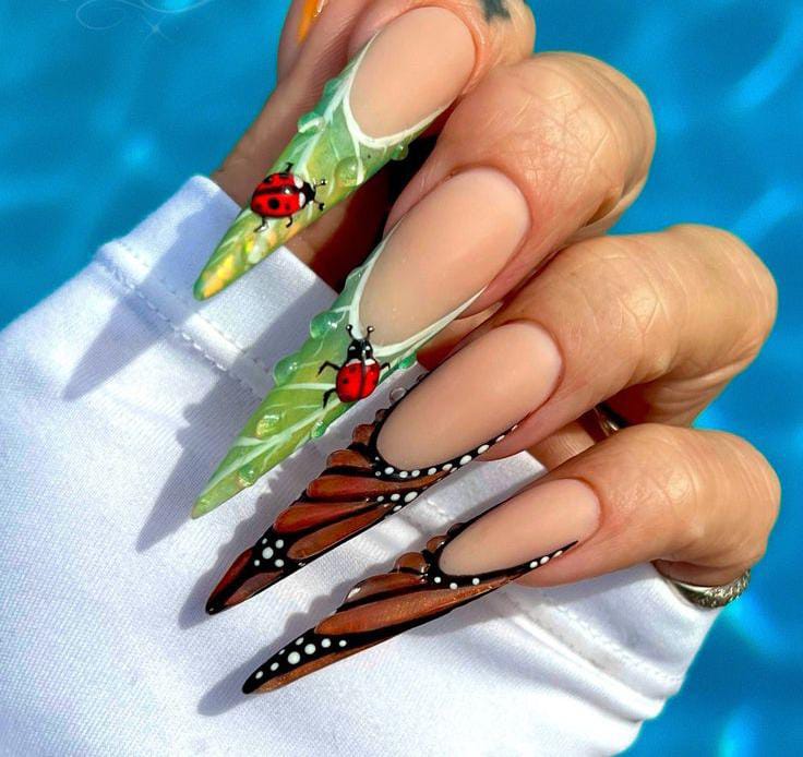 These extra-long stiletto nails balance soft leafy greens with bold butterfly wing patterns, each detailed with tiny dots and a pop of red from painted ladybugs.