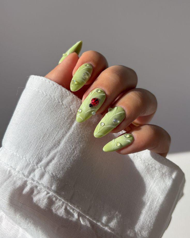 Soft green nails with delicate leaf-like textures and pearl accents are brought to life with a striking ladybug detail. The overall look is fresh, light, and inspired by the spring.