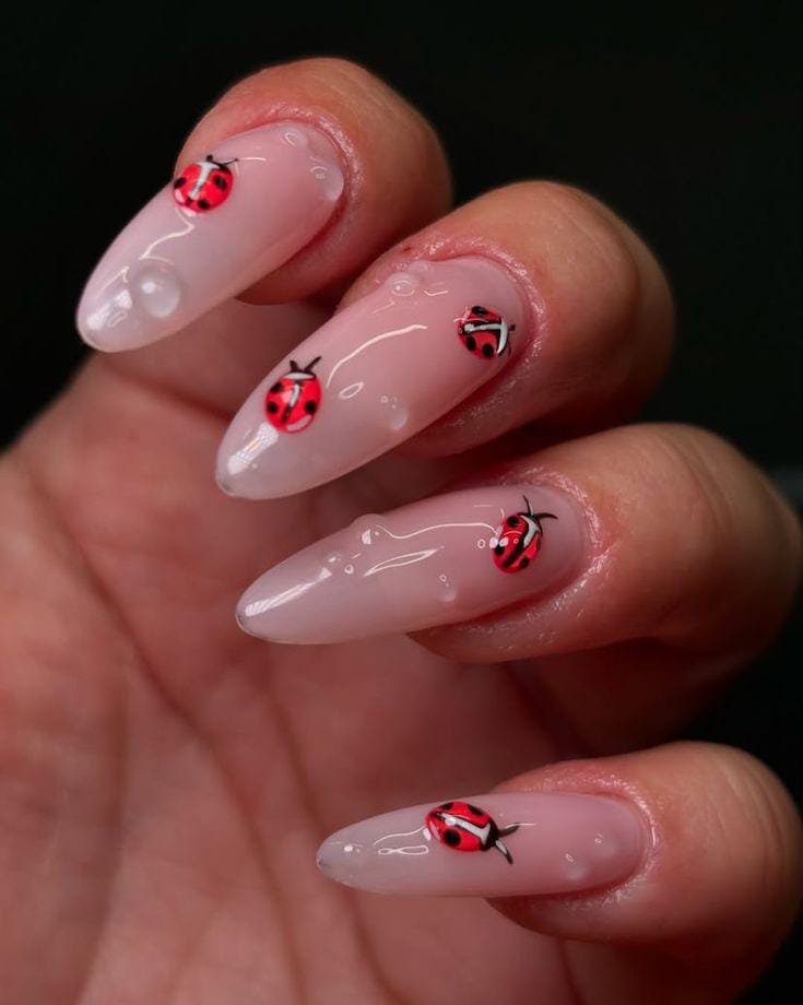 Clear glossy nails with tiny painted ladybugs scattered across create a simple yet eye-catching effect. The minimal style makes the design feel clean, playful, and easy.