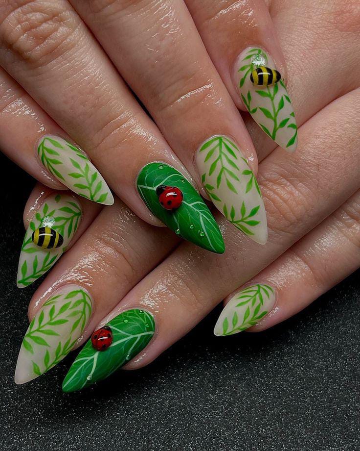 These long, pointed nails come alive with swirling green vines, glossy leaves, and tiny ladybugs climbing across the design.