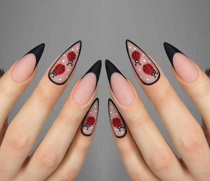 These stiletto nails combine a soft nude base with bold matte black tips, creating a sharp and stylish look. The accent nails feature ladybugs framed with tiny white dots.