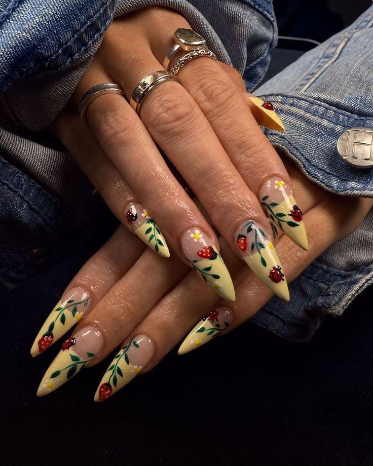 A cheerful nude and yellow base decorated with leafy vines, daisies, and red ladybugs makes this manicure feel like a sunny walk through a meadow. The long stiletto shape enhances the dramatic yet fresh and nature-inspired theme.