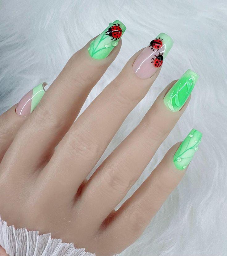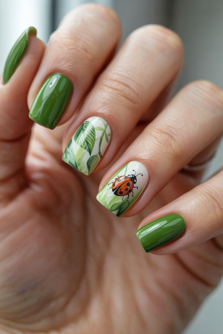Glossy green nails paired with leafy artwork and a realistic ladybug accent give this look a clean, earthy feel. The design strikes a balance between vibrant and natural, simple yet eye-catching details.
