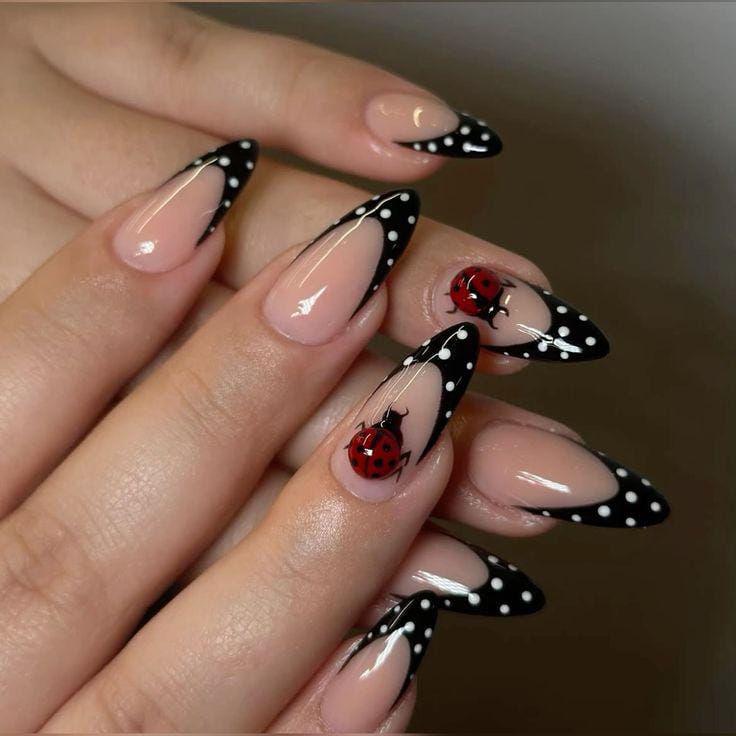 Glossy black French tips decorated with crisp white polka dots create a chic nighttime feel, while little ladybugs add a playful and unexpected twist.