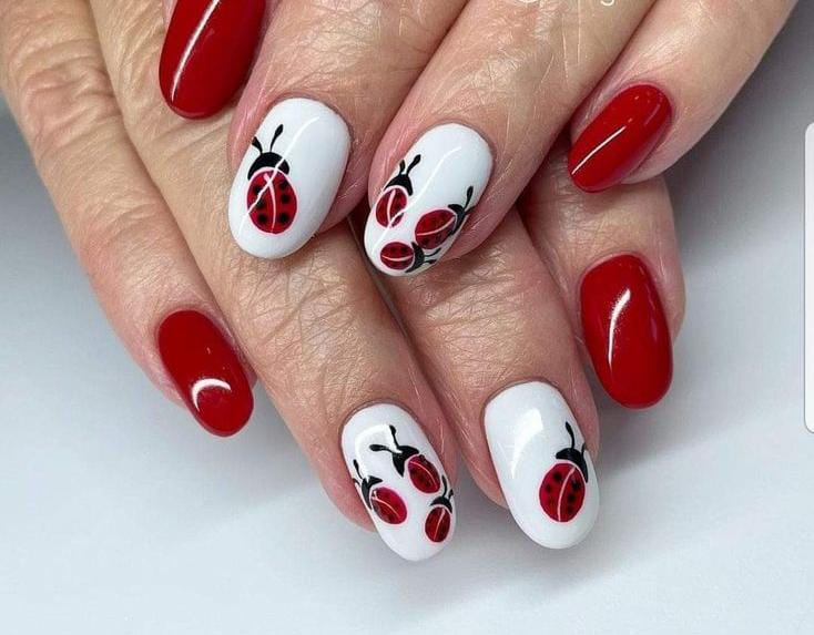 This design pairs bold red polish with crisp white nails, featuring charming ladybugs that pop against the background. The mix of solid colors and playful patterns creates a fun yet timeless style.