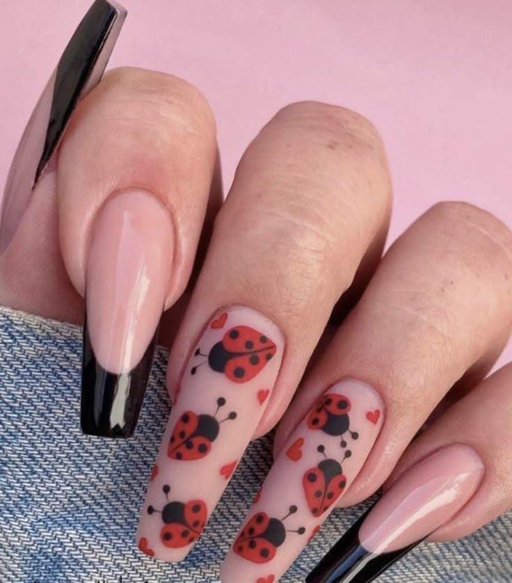 Simple yet bold with glossy nude and black French tips, paired with rows of cute ladybugs and tiny hearts for a sweet, romantic feel.