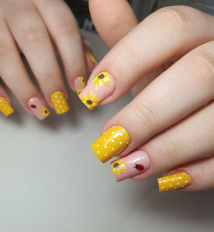 Cheerful sunflowers and polka dots in vibrant yellow bring a lively, warm look, with subtle ladybug accents that add a touch of nature’s charm.