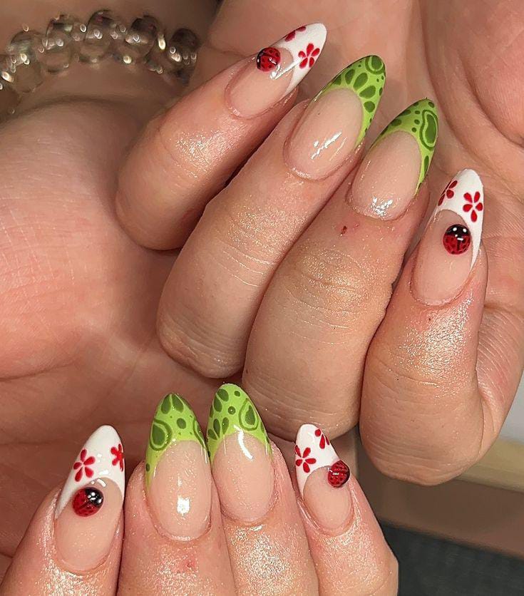 This design combines fresh green patterned French tips with clean white accents, decorated with bold red flowers and tiny ladybugs.